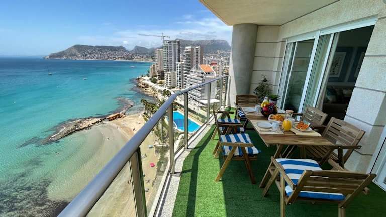 CLP - Calpe Barlovento - 6P bietet Übernachtungsmöglichkeiten mit einem eigenen Pool und Meerblick. Die Ferienwohnung umfasst zwei Schlafzimmer, ein Wohnzimmer sowie eine voll ausgestattete Küche. Zudem sind Klimaanlage und zwei Badezimmer vorhanden.