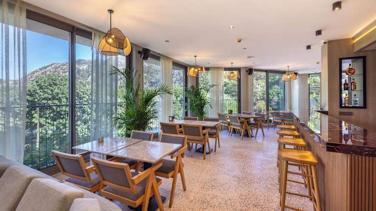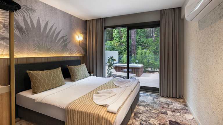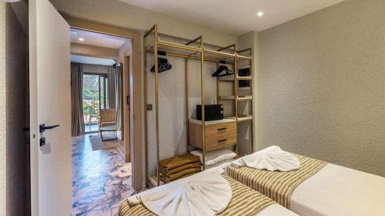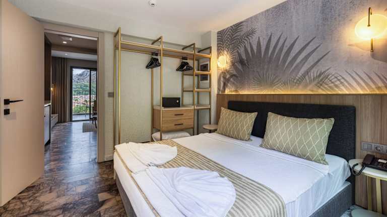 Die Zimmer sind klimatisiert und verfügen über einen Balkon oder eine Terrasse mit Bergblick. Die Ausstattung beinhaltet ein Doppelbett oder ein Sofabett, eine umfassend ausgestattete Kochnische mit Minikühlschrank, Mikrowelle und Tee-/Kaffeemaschine sowie ein eigenes Badezimmer mit Dusche und Badewanne. Weiterhin stehen ein Safe, eine Minibar und Sat-TV zur Verfügung. Es gibt auch rollstuhlgerechte Zimmer und Familienzimmer.