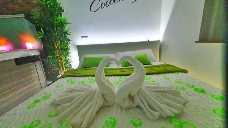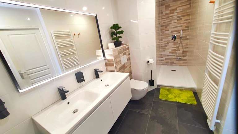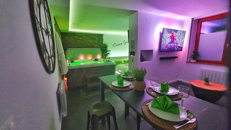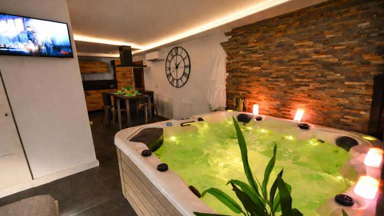 Die Ferienwohnung besteht aus einem Schlafzimmer, einem Wohnzimmer und einer voll ausgestatteten Küche mit Kühlschrank und Kaffeemaschine. Zudem ist ein Badezimmer mit Dusche und Whirlpool vorhanden. Handtücher und Bettwäsche werden bereitgestellt. Die Unterkunft bietet schallisolierte Zimmer sowie eine Klimaanlage, um den Gästen eine angenehme Bequemlichkeit zu gewährleisten.