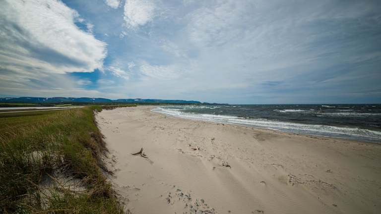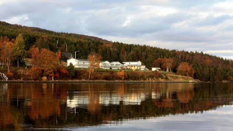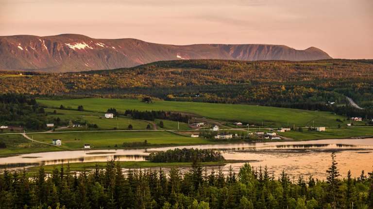 Die Unterkunft Codroy Valley Cottage Country liegt direkt am Strand in Doyles, umgeben von einer malerischen Naturlandschaft mit Flussblick und Bergen.