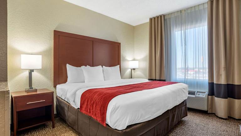Das Comfort Inn & Suites bietet eine angenehme Unterkunft mit insgesamt 67 Zimmern. Die Ausstattung umfasst einen Aufzug, eine Rezeption, Safes, einen Getränkeautomaten sowie eine Reihe von behindertengerechten Annehmlichkeiten. Es gibt sowohl Innen- als auch Aussenpools sowie einen Whirlpool im Wellnessbereich. Zusätzliche Einrichtungen wie ein Zeitungskiosk und ein TV-Raum stehen ebenfalls zur Verfügung. Parkiermöglichkeiten sind in einer Garage oder auf dem Parkplatz vorhanden.