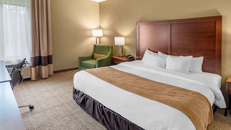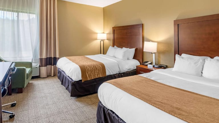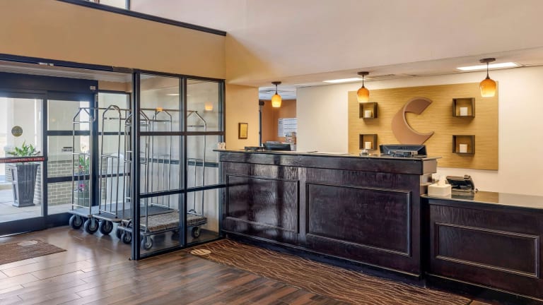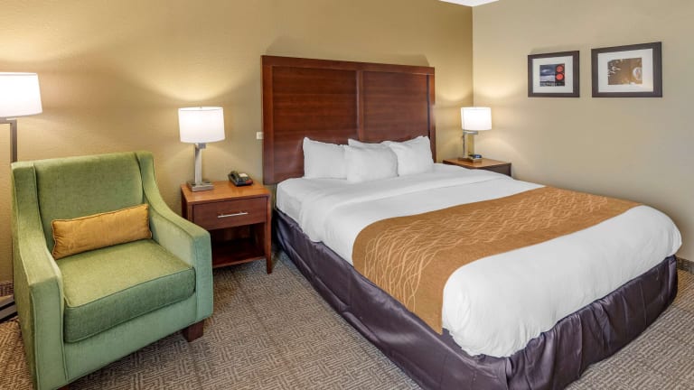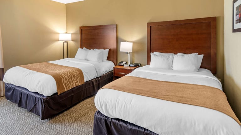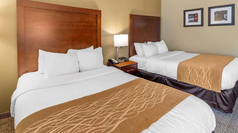 Morgens geniessen die Gäste im Comfort Inn ein kostenloses warmes Frühstück, das eiweissreiche Speisen wie Eier, Fleisch, Joghurt, frisches Obst, Müsli sowie eine Auswahl an warmen Waffeln umfasst.