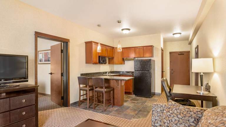 Die geräumigen Suiten verfügen über eine Klimaanlage, eine Heizung, ein Sofabett, einen Schreibtisch, einen Kühlschrank, eine Mikrowelle sowie eine Tee-/Kaffeemaschine. Zudem sind die Zimmer mit einem Flachbild-TV, einem Haartrockner und einem Bügelset ausgestattet. Es gibt kostenlose WLAN-Verbindung und eine komfortable Dusche oder eine Whirlwanne im Badezimmer. Barrierefreie Zimmer sind ebenfalls erhältlich.