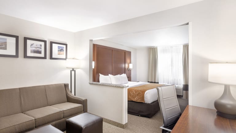 Das Comfort Suites Hotel bietet ein kostenloses warmes Frühstück, das Eier, Fleisch, Joghurt, frisches Obst, Müsli und weitere Spezialitäten umfasst. Gäste, die früh abreisen, haben die Möglichkeit, eine 'Your Suite Success Grab & Go'-Tasche zu erhalten. Das Buffet bietet eine kinderfreundliche Auswahl, und das Frühstück kann in einer gemütlichen Umgebung genossen werden.