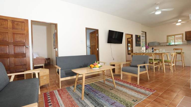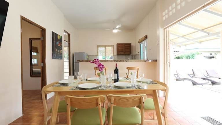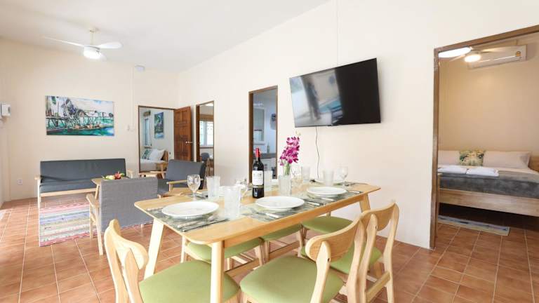 Die Unterkunft besteht aus 3 Schlafzimmern, 2 Badezimmern, einem Essbereich und einer voll ausgestatteten Küche. Die Zimmer sind mit Klimaanlage, Bettwäsche und Handtüchern ausgestattet. Ein Flachbild-TV und eine Terrasse mit Poolblick sind ebenfalls vorhanden, was zu einer angenehmen Bequemlichkeit beiträgt.