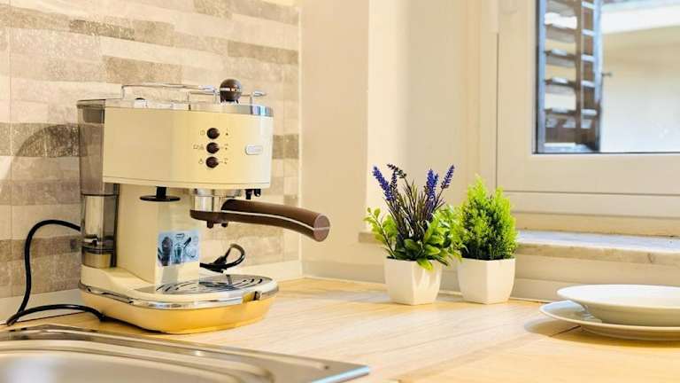 Die Unterkunft enthält eine voll ausgestattete Küche mit Kühlschrank und Kaffeemaschine, jedoch keine spezifischen Informationen zur Verpflegung.