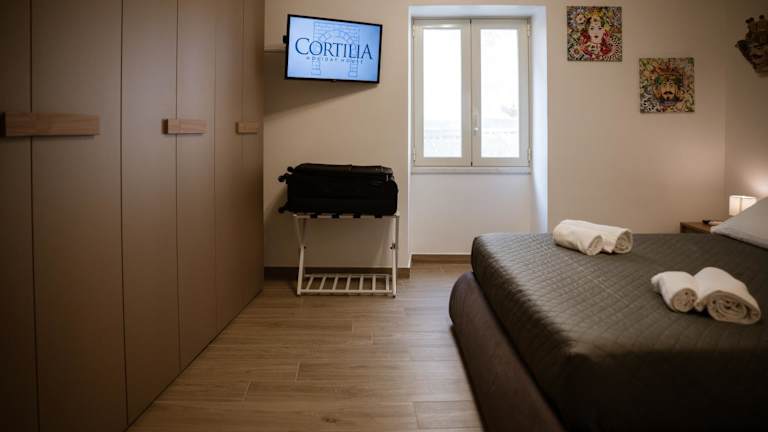 Cortilia Holiday House bietet Übernachtungsmöglichkeiten mit Klimaanlage und kostenlosem Wifi. Jede Wohneinheit verfügt über eine voll ausgestattete Küche mit Esstisch, einem Flachbild-TV mit Satellitenkanälen sowie einem eigenen Badezimmer mit Bidet, kostenlosen Pflegeprodukten und einem Haartrockner.