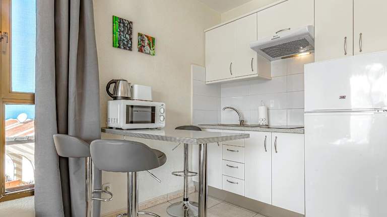 Die Ferienwohnung bietet ein Schlafzimmer, ein Wohnzimmer mit Poolblick, einen Flachbild-TV und eine gut ausgestattete Küche mit Kühlschrank und Mikrowelle. Das Badezimmer ist mit einem Bidet ausgestattet und es werden Handtücher sowie Bettwäsche zur Verfügung gestellt. Eine Terrasse mit Meerblick rundet das Angebot ab.