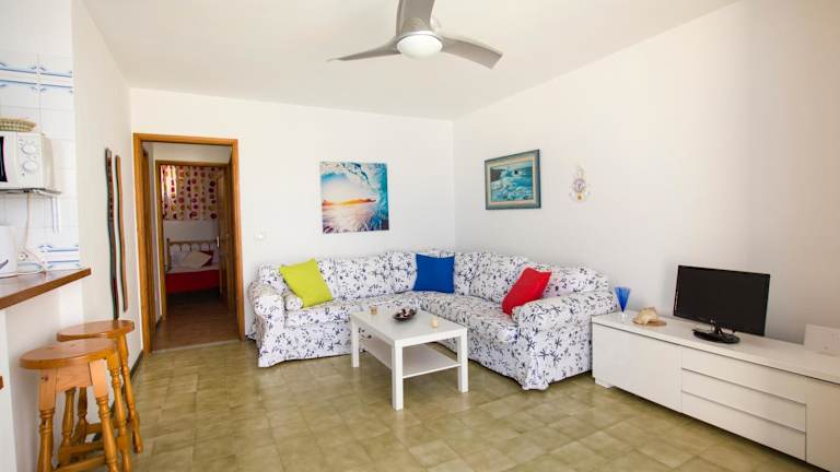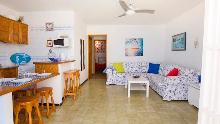 Die Ferienwohnung verfügt über zwei Schlafzimmer und ein Badezimmer. Die Ausstattung umfasst Bettwäsche, Handtücher, einen Fernseher, einen Essbereich und eine voll ausgestattete Küche. Die Terrasse bietet Meerblick.