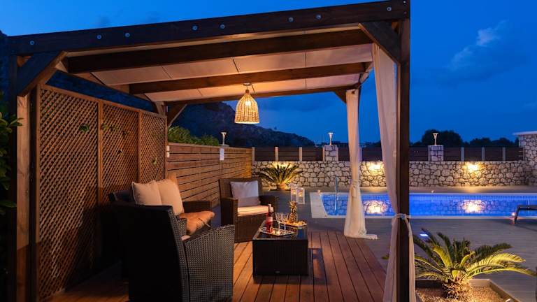 Die Unterkunft bietet ein modernes Ambiente mit kostenlosem WLAN, Klimaanlage sowie Zugang zu einem Garten mit einem Außenpool. Zur Ausstattung gehören zudem eine Terrasse mit Bergblick, ein Sitzbereich, ein Satelliten-Flachbild-TV und eine voll ausgestattete Küche.