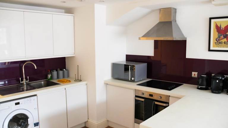 Die voll ausgestattete Küche der Ferienwohnung umfasst einen Kühlschrank und eine Kaffeemaschine, ideal für eine selbstständige Verpflegung. Es stehen Handtücher und Bettwäsche zur Verfügung, jedoch sind spezielle Verpflegungsoptionen oder Restaurantdienste nicht beschrieben.