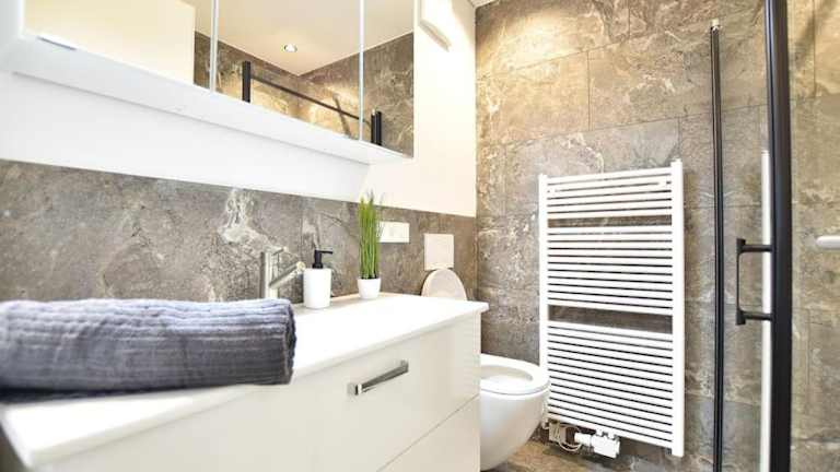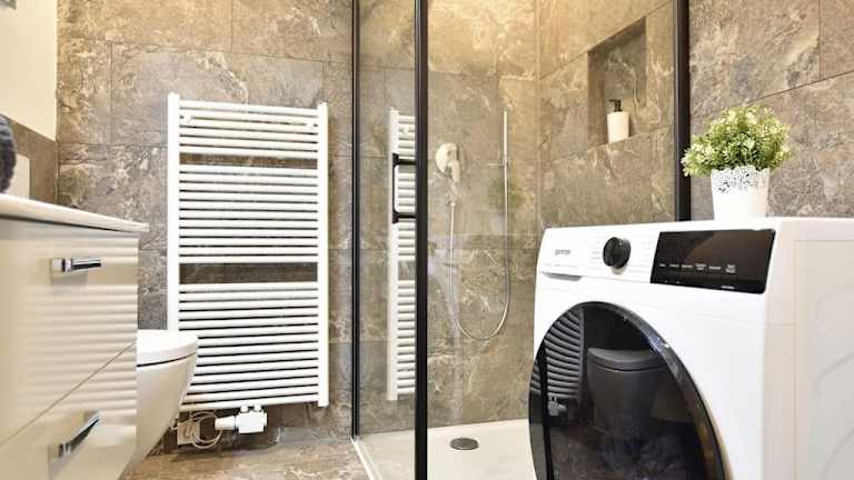 Die Ferienwohnung verfügt über ein Schlafzimmer und ein Badezimmer mit einer Dusche sowie einem Haartrockner.