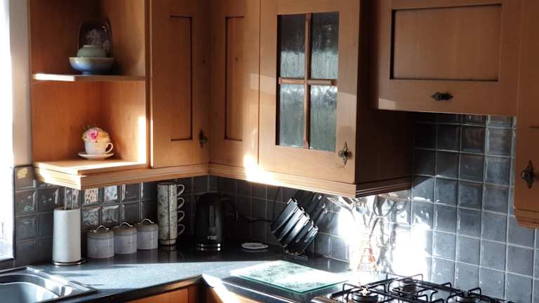 Das Ferienhaus bietet eine voll ausgestattete Küche, in der Gäste ihre eigenen Mahlzeiten zubereiten können. Zudem stehen Essbereich und Terrasse mit Gartenblick zur Verfügung. Grillmöglichkeiten sind ebenfalls vorhanden, um im Freien zu speisen.