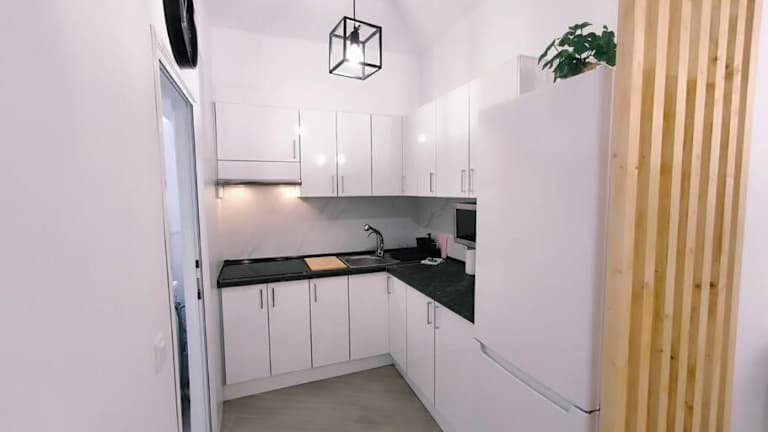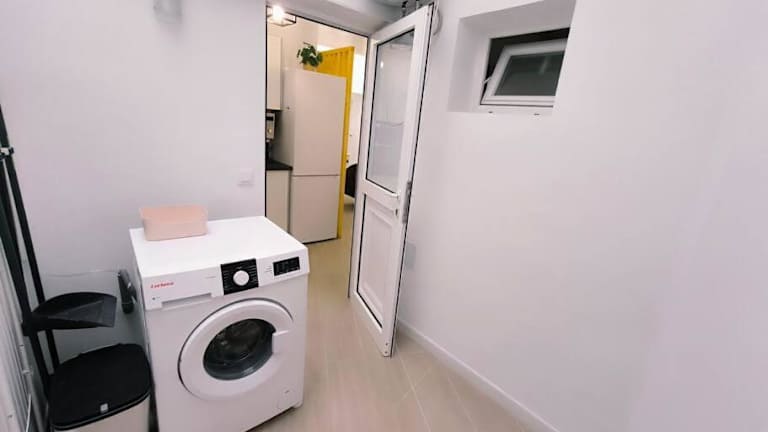 Die Ferienwohnung umfasst zwei Schlafzimmer und eine voll ausgestattete Küche mit einem Kühlschrank und einer Mikrowelle. Zusätzlich sind eine Waschmaschine und ein Badezimmer mit Haartrockner vorhanden. Bettwäsche und Handtücher werden bereitgestellt.