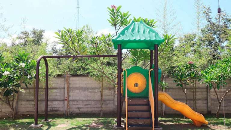 Gäste können neben dem eigenen Pool auch einen Kinderspielplatz nutzen.