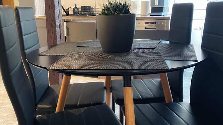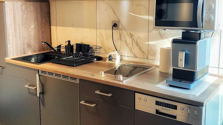 Die Ferienwohnung beinhaltet eine voll ausgestattete Küche mit einem Kühlschrank und einer Kaffeemaschine, sodass Gäste die Möglichkeit haben, eigene Mahlzeiten zuzubereiten. Es sind keine Informationen zu weiteren Verpflegungsmöglichkeiten vorhanden.