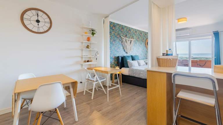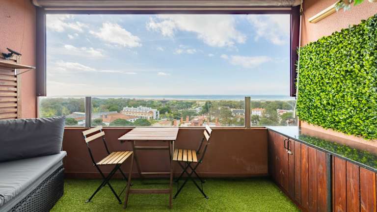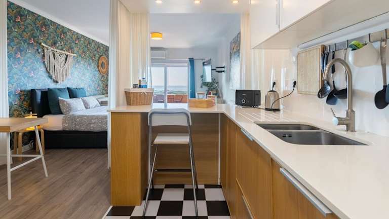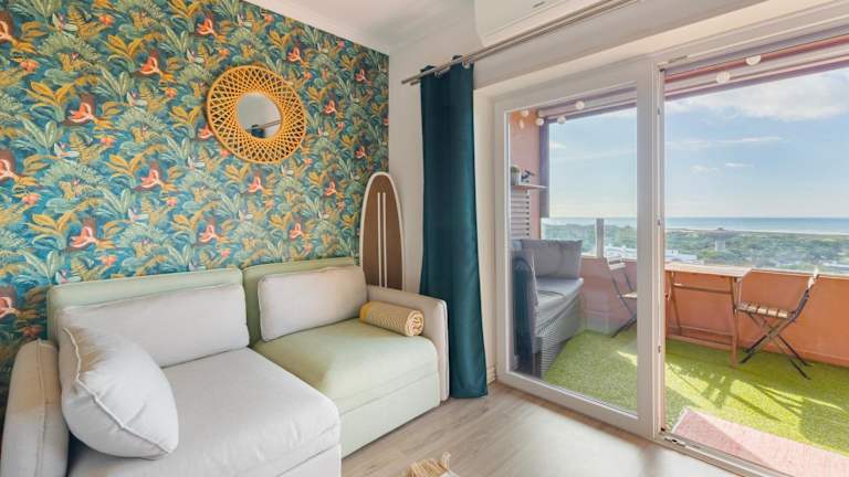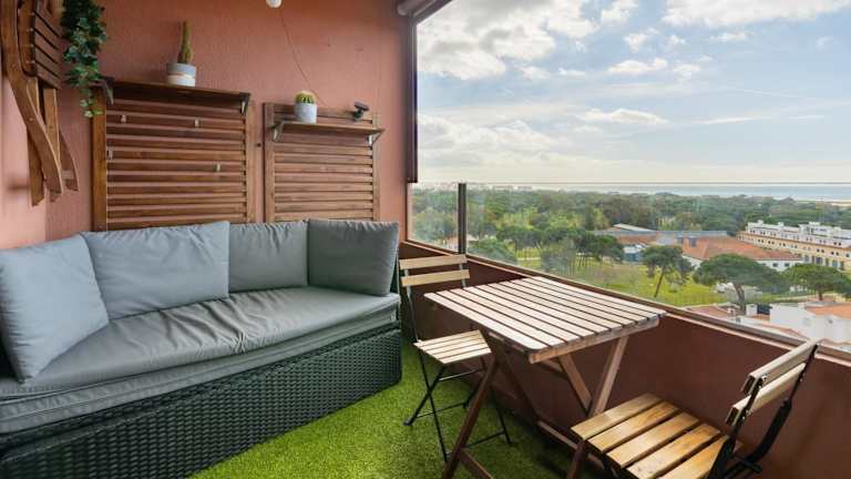 Das Cozy beach studio retreat near Lisbon with Sea View bietet klimatisierte Übernachtungsmöglichkeiten in einer für Strandferien idealen Lage. Die Unterkunft verfügt über einen Balkon sowie eine Terrasse mit Blick auf den Garten. Die Atmoshäre ist heimelig und einladend.