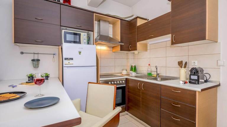 Die Ferienwohnung beinhaltet eine voll ausgestattete Küche mit Kühlschrank und Ofen, jedoch sind keine weiteren Informationen zu Verpflegungsmöglichkeiten verfügbar.