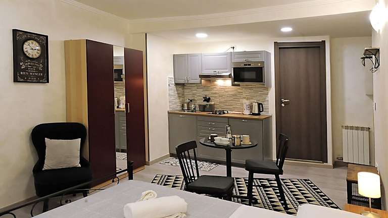 Die Ferienwohnung verfügt über 1 Schlafzimmer, ein Wohnzimmer sowie eine voll ausgestattete Küche mit Kühlschrank und Wasserkocher. Das Badezimmer ist mit einem Bidet und einer Dusche ausgestattet. Handtücher und Bettwäsche werden bereitgestellt.