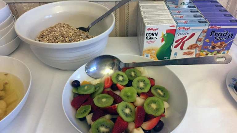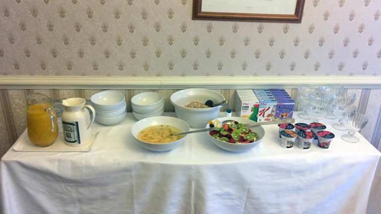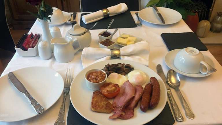 Das Frühstück wird im eleganten Speisesaal mit Erkerfenster serviert. Die Gäste haben die Wahl zwischen einem englischen Frühstück mit Eiern, Speck, Würstchen und Pilzen oder einem gesunden Frühstück mit Müsli, Joghurt und frischem Obst. Zudem ist eine Essenslieferung in die Unterkunft möglich.