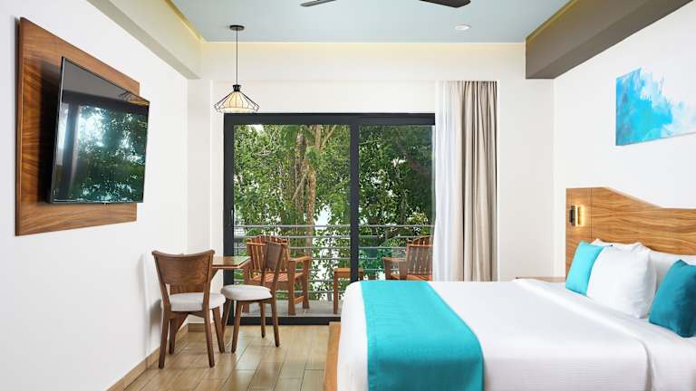 Die Zimmer sind klimatisiert und verfügen über eine Terrasse sowie eine moderne Ausstattung mit Doppel-, Queensize- oder Kingsize-Betten. Zur weiteren Ausstattung gehören ein Safe, eine Minibar, ein Schreibtisch, ein Flachbildfernseher sowie kostenloses WLAN. In den Badezimmern finden sich Haartrockner und Bademäntel. Alle Zimmer sind Nichtraucherzimmer und bieten einen Balkon oder Seeblick.