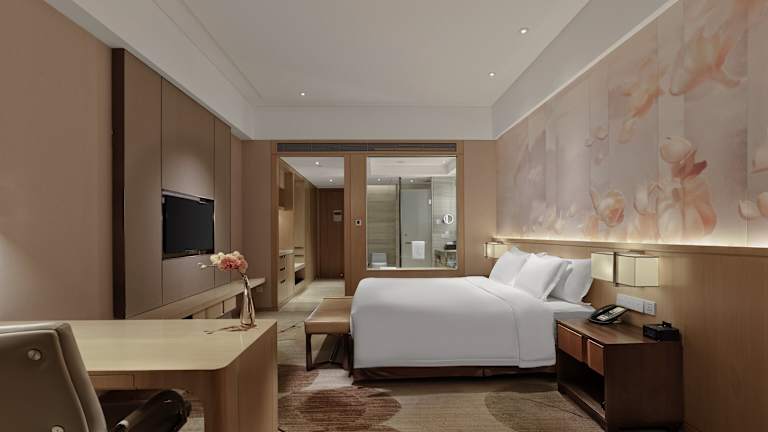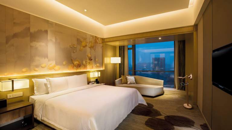 Die Zimmer verfügen über raumhohe Fenster mit Blick auf den Fluss Minjiang, ein Doppelbett, Klimaanlage, Heizung sowie einen Schreibtisch. Weiterhin sind ein Safe, ein Minikühlschrank und eine Tee-/Kaffeemaschine vorhanden. Gäste können einen Flachbildschirmfernseher sowie kostenloses Wifi nutzen. In den Bädern finden sich eine Dusche und eine Badewanne, Bademäntel sowie Kosmetikartikel. Es gibt Nichtraucherzimmer und rollstuhlgerechte Zimmer mit barrierefreien Badezimmern.