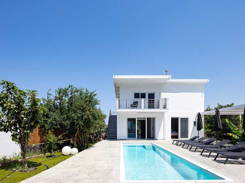 Cyan Viewpoint House near Lake Kourna bietet klimatisierte Übernachtungsmöglichkeiten mit einem Balkon und kostenlosem Wifi. Das Ferienhaus verfügt über einen eigenen Pool, einen Garten sowie gratis Parkiermöglichkeiten.