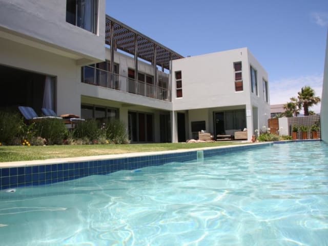 da Heim – das Gästehaus direkt am Strand Auf Ihrer Reise nach Kapstadt fühlen Sie sich “da Heim” im wahrsten Sinne des Wortes wie zu Hause. Abseits von der Großstadt-Hektik Kapstadts, ist das Zentrum der Kapmetropole trotzdem in 15 min erreichbar. Das 4-Sterne-Haus “da Heim” liegt direkt am Strand der Tafelbucht. Genießen Sie die weiten Strände und die angenehme Atmosphäre des großen Gartens oder schwimmen Sie ein paar Bahnen im solarbeheizten 25m-Pool. Radfahrer, Schwimmer, Läufer, Triathleten, Wassersportler und Golfer finden alles, was sie für ihr Training benötigen, direkt vor Ort. Windsurfer riggen auf dem Grundstück auf und gehen zu Fuß zum Strand, während ihre “bessere Hälfte” die Sonne am Pool im windgeschützten Garten genießt. Der Milnerton Golf Course (18 Löcher) ist in 15 Fußminuten zu erreichen, und das Lauf- und Fahrradtraining beginnt direkt am Gästehaus. Ihr Urlaubswetter von heute: www.wetteronline.de Ihr Surfwetter von heute: www.windfinder.de Sunset Beach ist die sicherste Gegend im gesamten Western Cape. Das Gästehaus ist alarmgesichert, und die Region wird zusätzlich rund um die Uhr durch Wachdienste der Gemeinde überwacht. Appartements mit Meerblick Die Appartements des 2006 erbauten Hauses sind modern und komfortabel eingerichtet. Sie können zwischen 2 deutschen und 10 nationalen Fernsehsendern sowie Musiksendern wählen oder aber an den Flatscreen-LCD-Fernseher Ihren iPod anschließen. Internetanschluß (wireless DSL) steht kostenlos zur Verfügung.