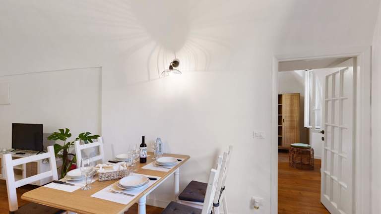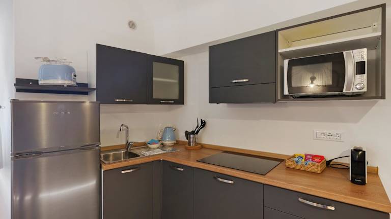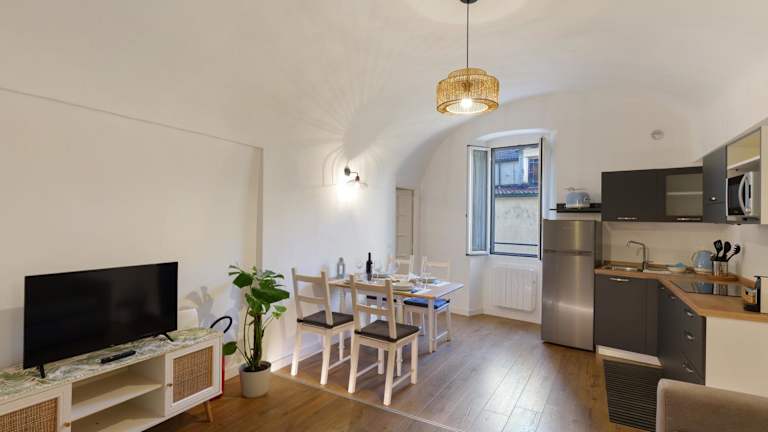 Die Ferienwohnung besteht aus 1 Schlafzimmer, einem Wohnzimmer und einer voll ausgestatteten Küche mit Kühlschrank und Kaffeemaschine. Zudem beinhaltet sie ein Badezimmer mit Bidet und Dusche. Handtücher und Bettwäsche werden zur Verfügung gestellt.