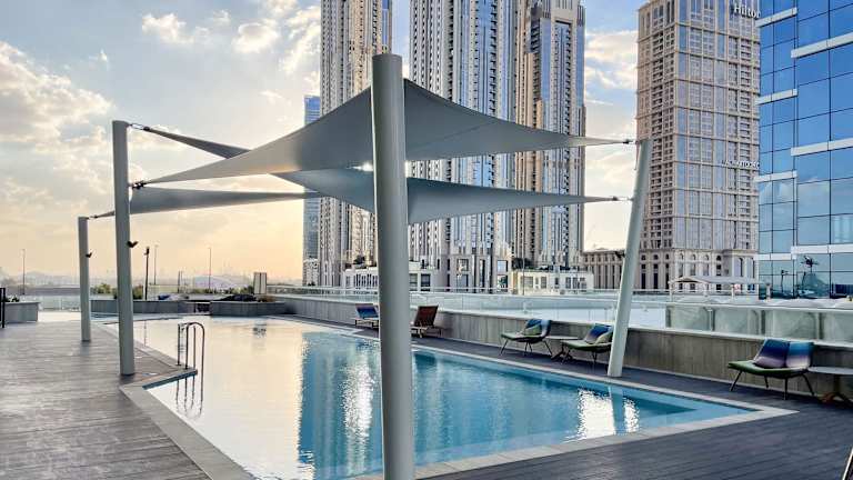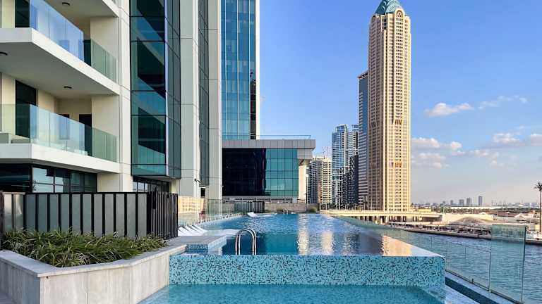 Damac Maison Prive Deluxe Studio with Water Canal View bietet Übernachtungsmöglichkeiten mit einem Aussenpool, einem kostenlosen Privatparkplatz, einem Fitnesscenter und einem schönen Garten. Die Unterkunft verfügt über eine Vielzahl von Einrichtungen, darunter ein Restaurant, einen Friseur, eine Sauna und einen Zimmerservice. Ein Conciergeservice sowie ein Währungsumtausch sind ebenfalls vorhanden.