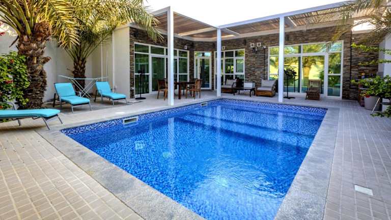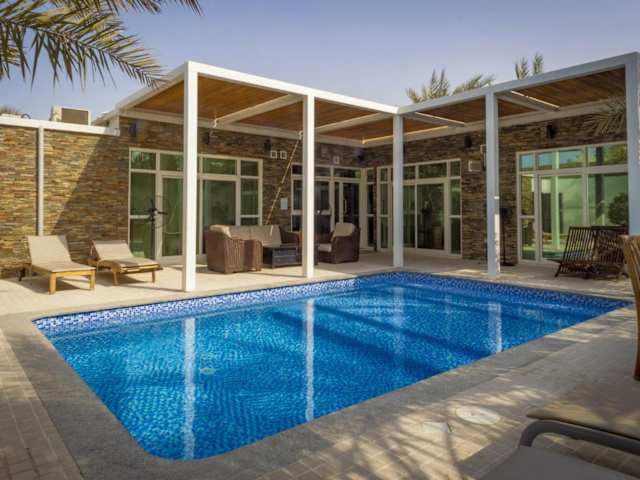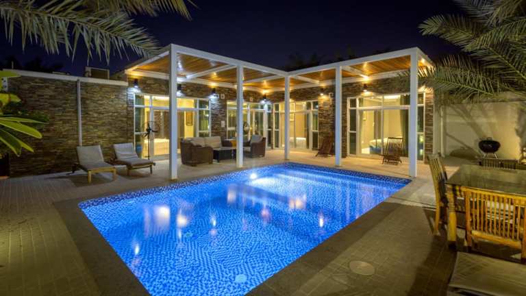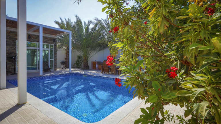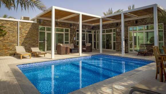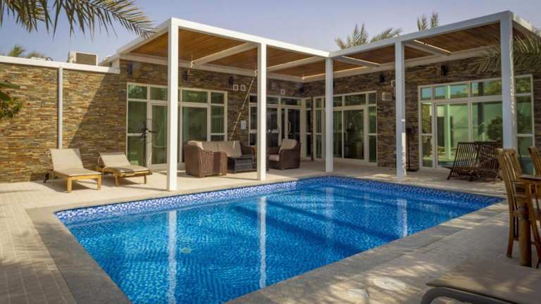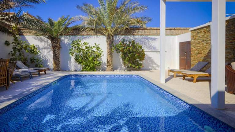 Die Dar 66 Pool Chalets mit Whirlpool befinden sich in einer ruhigen Wohngegend, etwa 5 Fahrminuten vom Strand entfernt. Die Umgebung bietet eine Vielzahl an Freizeitmöglichkeiten, wie ruhige Strände, den Island Water Park, den Golfplatz Al-Hamra, einen Jachthafen sowie das Einkaufszentrum Al-Hamra Mall. Der Flughafen RAK liegt in einer Entfernung von 18 km.