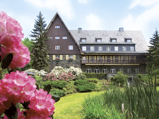 Das Waldidyll ist, ohne zu übertreiben, ein Hideaway und Ruhepol. Die trutzige Erscheinung des Gebäudes erinnert an einen Adelssitz auf dem Land. Was jedoch der wahre Schatz ist, das ist die gute sauerstoffreiche Luft, durch den Wald erschaffen. Und die große Erholung die sich einstellt, wenn man hier weilt. Die Ruhe und das Vogelzwitschern, der Blick auf den Seerosenteich und auf den gepflegten Park mal nur so nebenbei. Auch wenn es keine Gastronomie mehr im Hotel gibt -wir haben reichlich gute Kollegen um uns herum- es findet der Mehrwert im Übernachten und im Erholen statt. Das Frühstück ist immer inklusive und rundet den Aufenthalt ab. Wer Lust hat, geht in die Sauna und genießt auch dort das "Allein-sein" - bucht sich sein Zeitfenster. Luxus ist vielfältig zu verstehen. Ruhe und Alleinsein-dürfen gehören definitiv dazu.