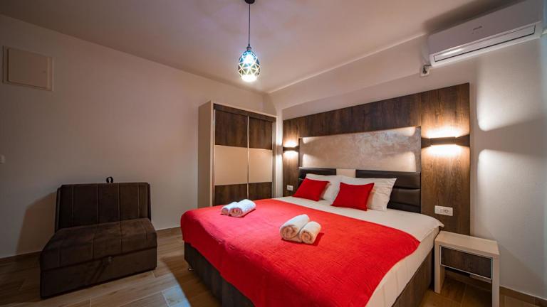Die Unterkunft David Lux beach rooms befindet sich in Dobra Voda, nur 70 Meter vom Strand Mali Pijesak und etwa 200 Meter vom Strand Veliki Pijesak entfernt. Der Hafen von Bar liegt 13 km und der Skutarisee 35 km entfernt. Der nächstgelegene Flughafen ist der Flughafen Podgorica, 54 km von der Unterkunft entfernt.