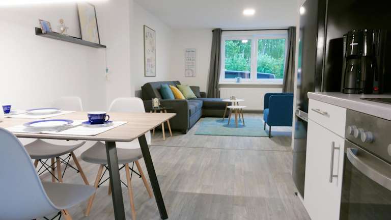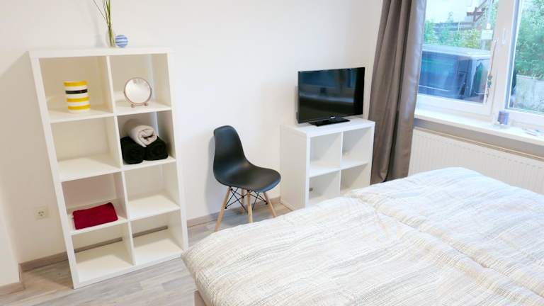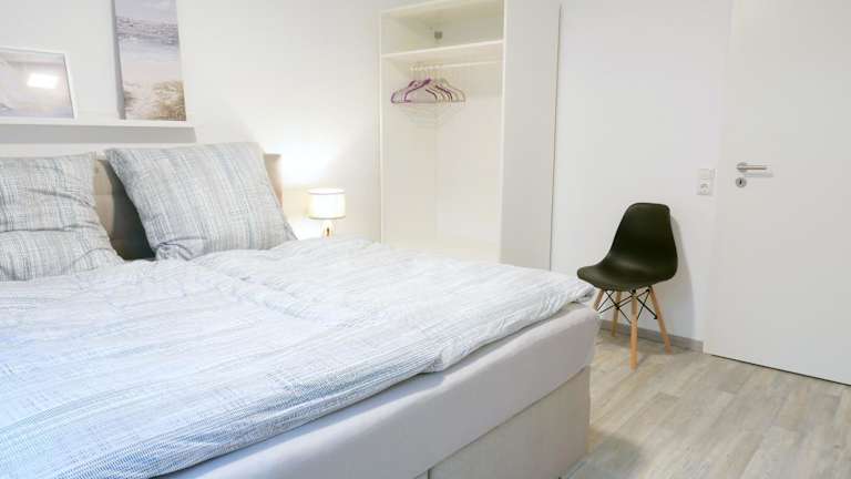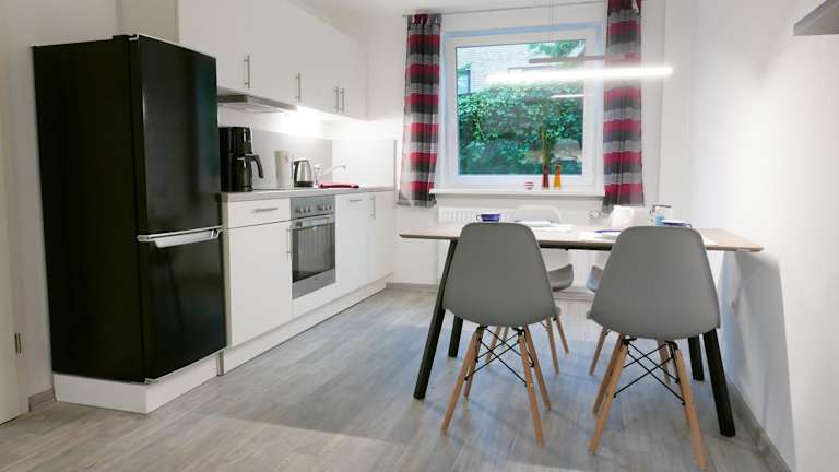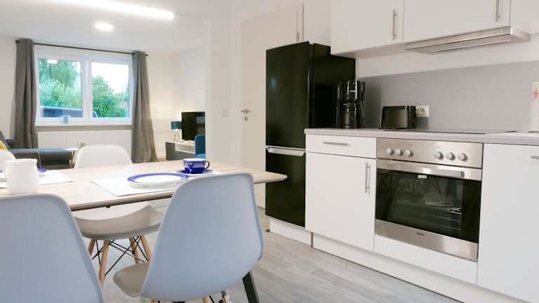 Die Ferienwohnung umfasst ein Schlafzimmer, ein Wohnzimmer und eine voll ausgestattete Küche mit Kühlschrank und Kaffeemaschine. Zu den Annehmlichkeiten gehören ein Badezimmer mit Dusche und Haartrockner. Handtücher und Bettwäsche werden bereitgestellt.