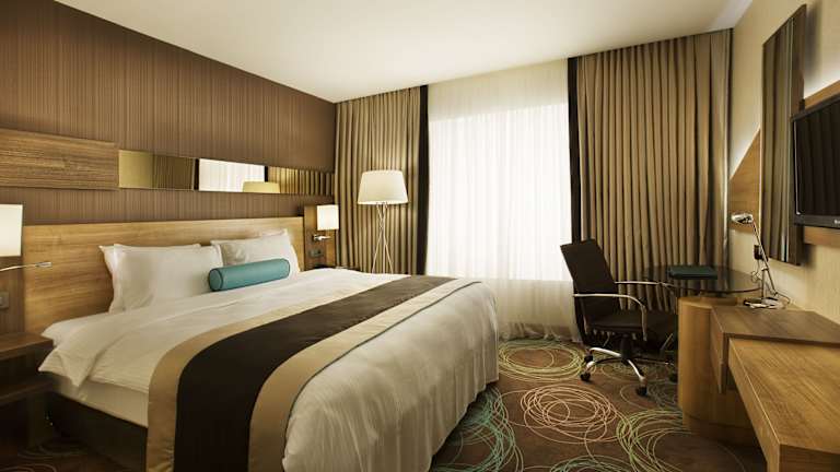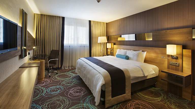 Die klimatisierten Zimmer sind mit Teppichböden, einem Doppelbett sowie einem Schreibtisch ausgestattet. Zur weiteren Ausstattung gehören ein Safe, eine Minibar, ein Kühlschrank und eine Tee-/Kaffeemaschine. Jedes Zimmer verfügt über ein eigenes Badezimmer mit Dusche und Haartrockner, ebenso wie über TV und kostenloses Wifi. Rolllstuhlgerechte Zimmer sind ebenfalls verfügbar.