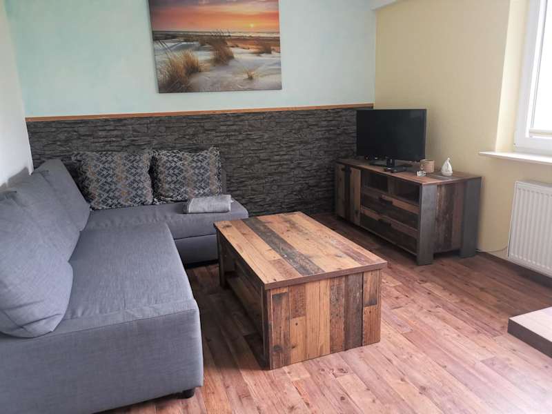 Die Ferienwohnung bietet eine Terrasse, ein Schlafzimmer, ein Wohnzimmer und eine gut ausgestattete Küche mit Kühlschrank und Ofen. Zudem ist ein TV vorhanden.