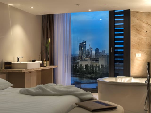 Holz und warme Farbtönen verleihen den großzügig und stilvoll eingerichteten 223 Zimmern und Suiten ein wahres Wohlfühl-Ambiente. Mit komfortablen Boxspringbetten und -matratzen wird ein gesunder und energiereicher Schlaf garantiert. Durch das offene Design des Badezimmers mit integrierter Regendusche und separatem WC wird der Raum mit Sonnelicht gefüllt. Zudem ermöglichen die bodentiefen Fenster einen freien Blick über den unmittelbar angrenzenden Main-Fluss und die Stadt Offenbach. Alle 114 Komfort Zimmer mit zwei Queensize-Betten sowie 64 Deluxe Zimmer mit Kingsizebetten bieten einen 43“ HD Flachbildschirm-Fernseher mit deutschen, internationalen sowie chinesischen Fernsehsendern, einer inkludierten Tee- und Kaffee Station sowie kostenfreies Wi-Fi. Die weiteren 14 Suiten werden ergänzt durch einen seperaten Wohnbereich mit integrierter Kitchenette. Unserer Executive Suite mit Blick hoch über die Dächer von Offenbach und Frankfurt verfügt darüber hinaus über ein zusätzliches Gästezimmer sowie einem eigenen Konferenzraum.