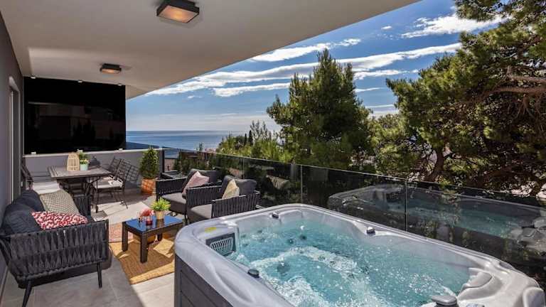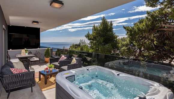 Die Deluxe Suite mit Jacuzzi und Meerblick bietet einen eindrucksvollen Blick aufs Meer und einen Balkon. Die Unterkunft verfügt über eine Terrasse und einen kostenlosen Privatparkplatz. Die Suite ist klimatisiert und ideal für bis zu zwei Personen.