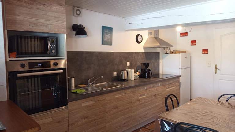Die gut ausgestattete Küche bietet eine praktische Option für Selbstversorger mit Kühlschrank und Ofen.