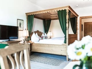 Liebevolle Details! Knarrende Lärchenholzböden, handgewebte Schafwollteppiche, Vollholzmöbel vom Eugendorfer Tischler, Vorhänge aus Altsalzburger Handdrucken, handgeschmiedete Messinglampen, alte Bauernmöbel … der Holznerwirt hat so manches versteckte Highlight parat.
