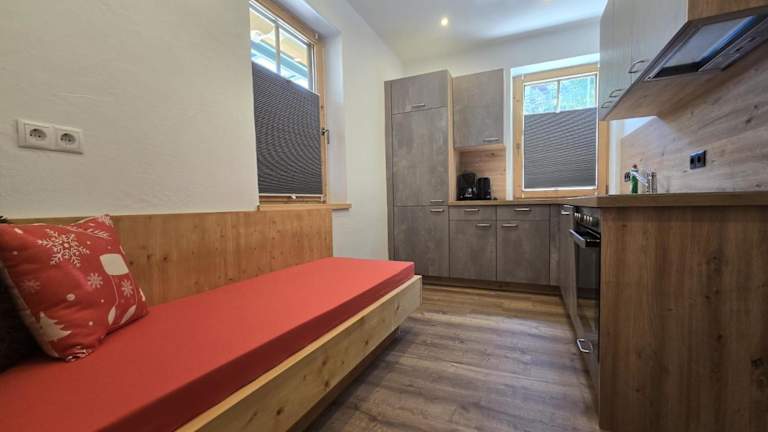 Einige Wohneinheiten im Der Waidachhof Zillertal sind mit einer Küche ausgestattet, die einen Kühlschrank, einen Geschirrspüler und einen Ofen umfasst.