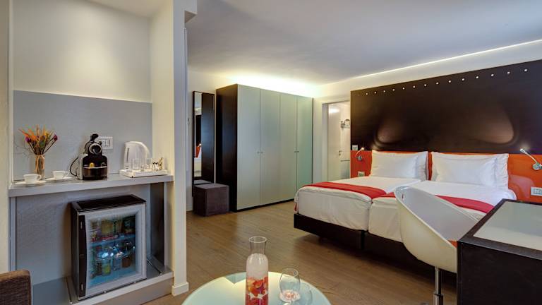Die Zimmer sind mit Klimaanlage und Heizung ausgestattet und verfügen über ein Queensizebett sowie ein Sofabett. Auf Anfrage sind Zustellbetten erhältlich. Zu den Annehmlichkeiten gehören ein Safe, eine Minibar, ein Schreibtisch und eine Tee-/Kaffeemaschine. Jedes Zimmer bietet zudem ein Telefon, ein TV-Gerät und kostenfreies Wifi. Die Badezimmer sind mit einer Dusche und einer Badewanne ausgestattet. Es werden sowohl Familien- als auch Nichtraucherzimmer angeboten.