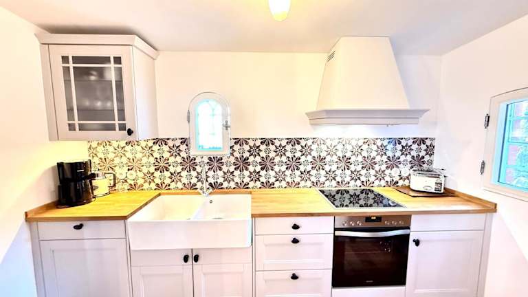 Die Ferienwohnung verfügt über eine Küchenzeile, ausgestattet mit einem Kühlschrank, Geschirrspüler, Ofen, Kaffeemaschine und Wasserkocher. Es sind keine weiteren Verpflegungsmöglichkeiten angegeben.