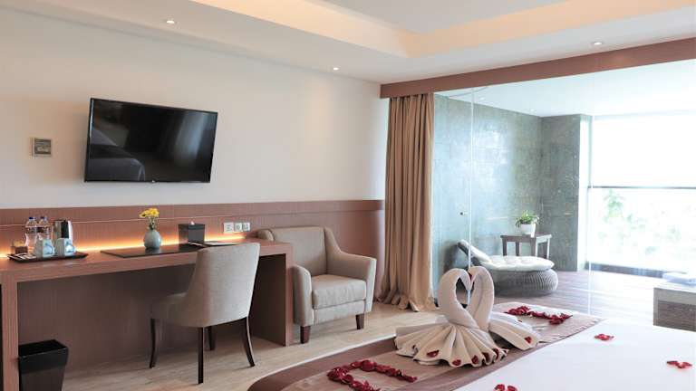 Die Zimmer sind klimatisiert und geschmackvoll eingerichtet. Sie bieten Annehmlichkeiten wie einen Balkon, ein Kingsizebett oder ein Sofabett, einen Safe, eine Minibar, einen Kühlschrank, eine Mikrowelle sowie eine Tee- und Kaffeemaschine. Ein eigenes Bad mit Dusche, Badewanne oder Whirlwanne sowie kostenlosen Pflegeprodukten ist ebenfalls vorhanden. Zu den modernen Einrichtungen zählen ein Flachbild-Kabel-TV und kostenloses Wifi.
