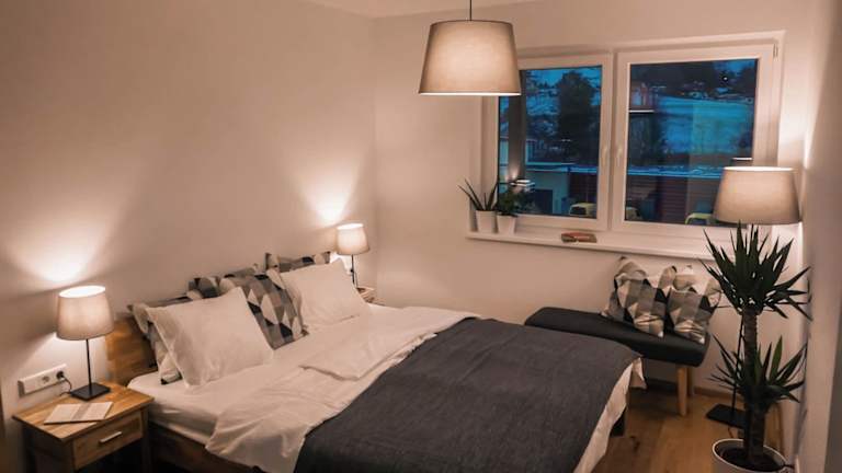 Das Apartment beinhaltet zwei Schlafzimmer, ein Wohnzimmer und ein Badezimmer mit einer Dusche. Die gut ausgestattete Küche verfügt über einen Kühlschrank und einen Geschirrspüler. Eine Terrasse mit Stadtblick ist ebenfalls vorhanden. Handtücher und Bettwäsche werden zur Verfügung gestellt. Ein Kinderspielplatz steht zur Verfügung.