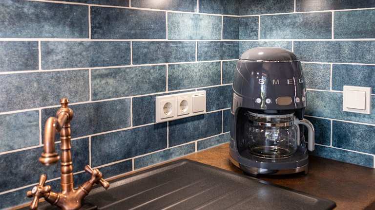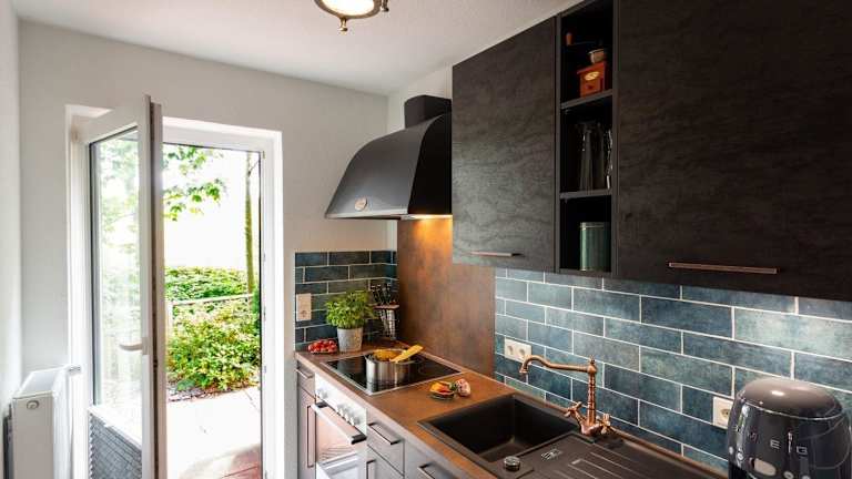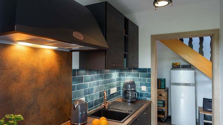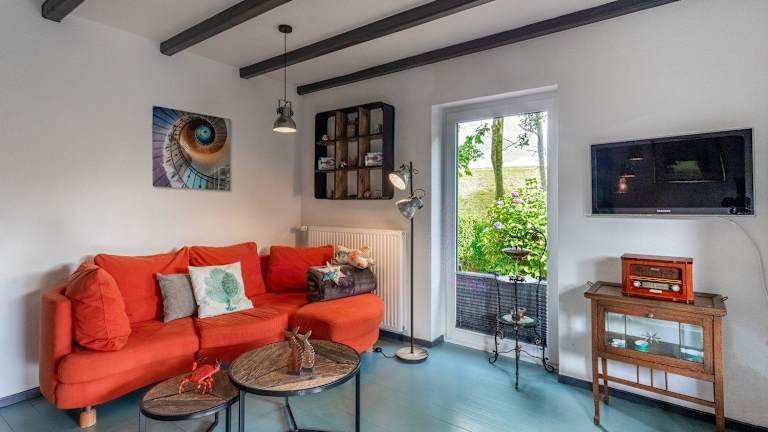 Die Ferienwohnung verfügt über ein Schlafzimmer, einen TV und eine voll ausgestattete Küchenzeile mit Kühlschrank, Geschirrspüler, Waschmaschine, Ofen und Mikrowelle.