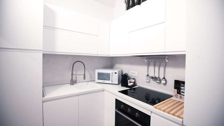 Die Ferienwohnung verfügt über eine voll ausgestattete Küche, die einen Kühlschrank, einen Geschirrspüler, eine Mikrowelle, eine Kaffeemaschine und einen Wasserkocher umfasst.