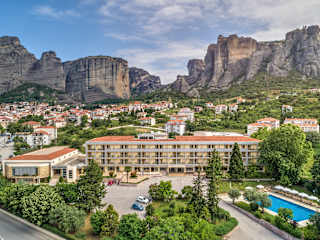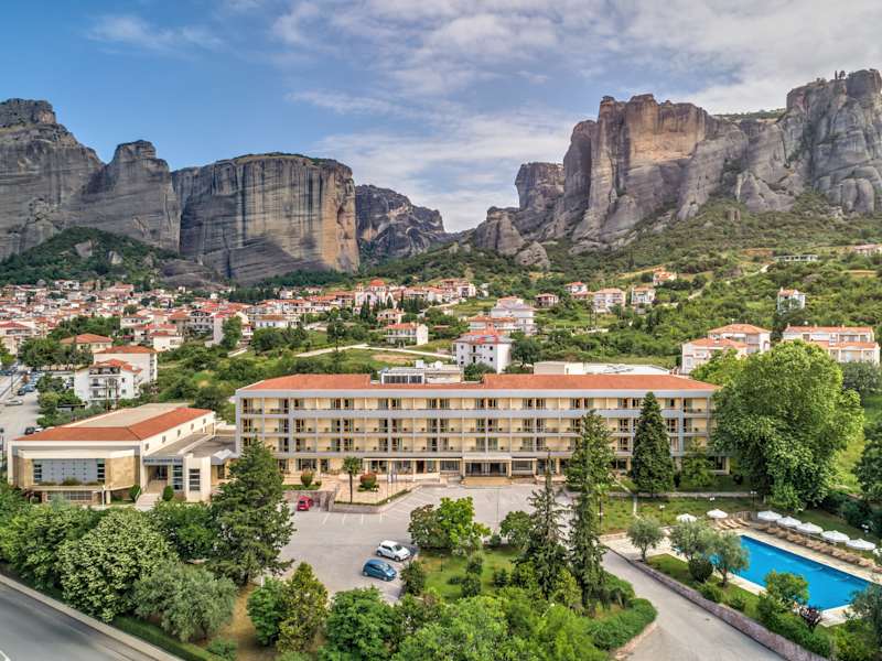 Das Hotel befindet sich am Fuße der Metéora-Klöster in der kleinen Ortschaft Kalambaka. In unmittelbarer Nähe finden sich Einkaufs- und Unterhaltungsmöglichkeiten, sowie die nächste Haltestelle für öffentliche Verkehrsmittel, die etwa 200 Meter entfernt ist. Das Stadtzentrum liegt circa 50 m entfernt und die Skipisten sind etwa 35 km entfernt.