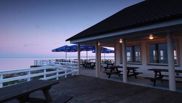 Das Frühstücksbuffet wird im Speisesaal mit raumhohen Fenstern und Holztischen serviert. In der Sommersaison besteht die Möglichkeit, im hauseigenen Café zu verweilen.