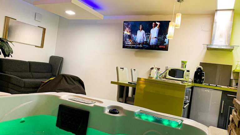Die Unterkunft bietet Zimmer mit einem Sitzbereich, einem Flachbild-TV und einer voll ausgestatteten Küche, die einen Kühlschrank und eine Mikrowelle beinhaltet. Jedes Zimmer verfügt über ein eigenes Badezimmer mit Dusche, kostenlosen Pflegeprodukten, einem Haartrockner sowie einem Whirlpool.